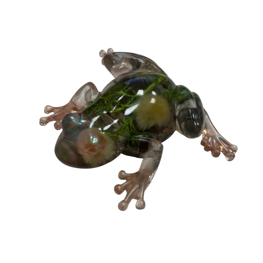 Rankų darbo kūrinys iš epoksido, kurio viduje įamžintas tikras kankorėžis bei šakelių dekoras.