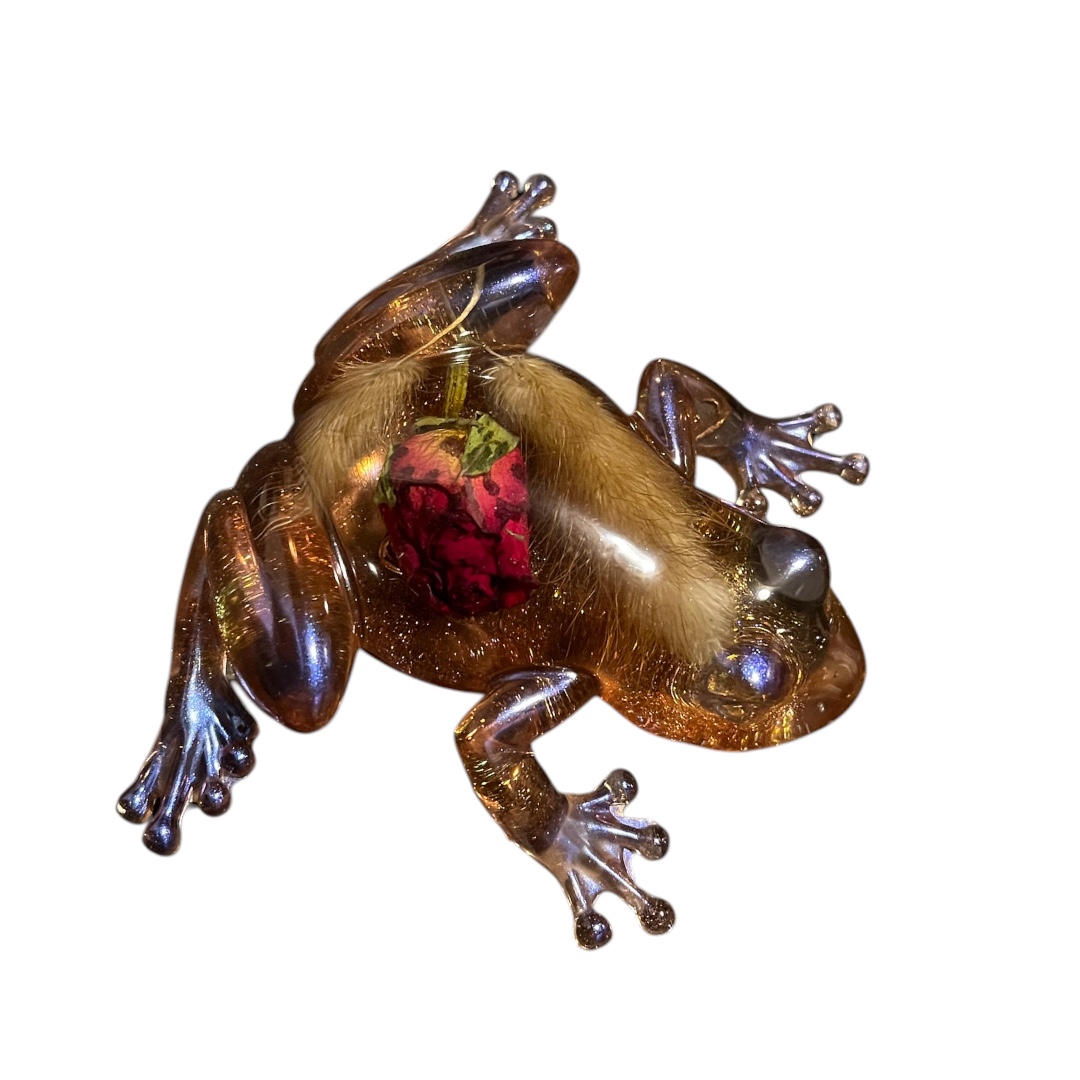 Rankų darbo kūrinys iš epoksido, kurio viduje įamžintas džiovinta rožė bei šakelių dekoras.