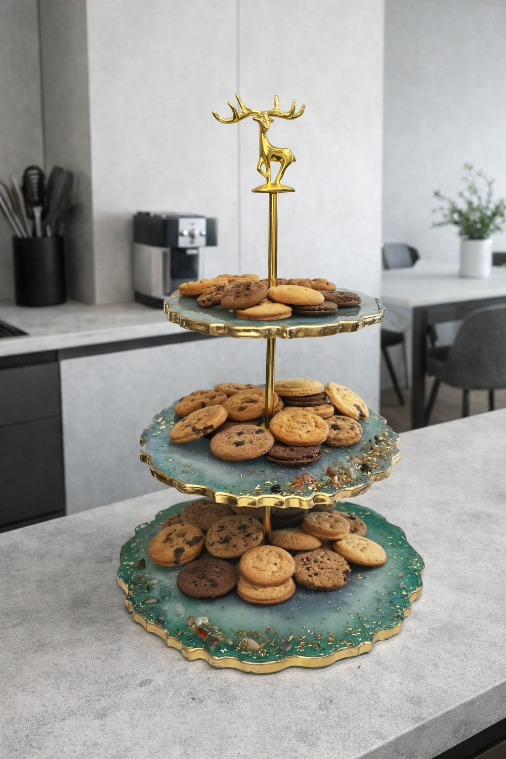 Trijų aukštų serviravimo padėklas – įspūdinga ir praktiška interjero detalė.