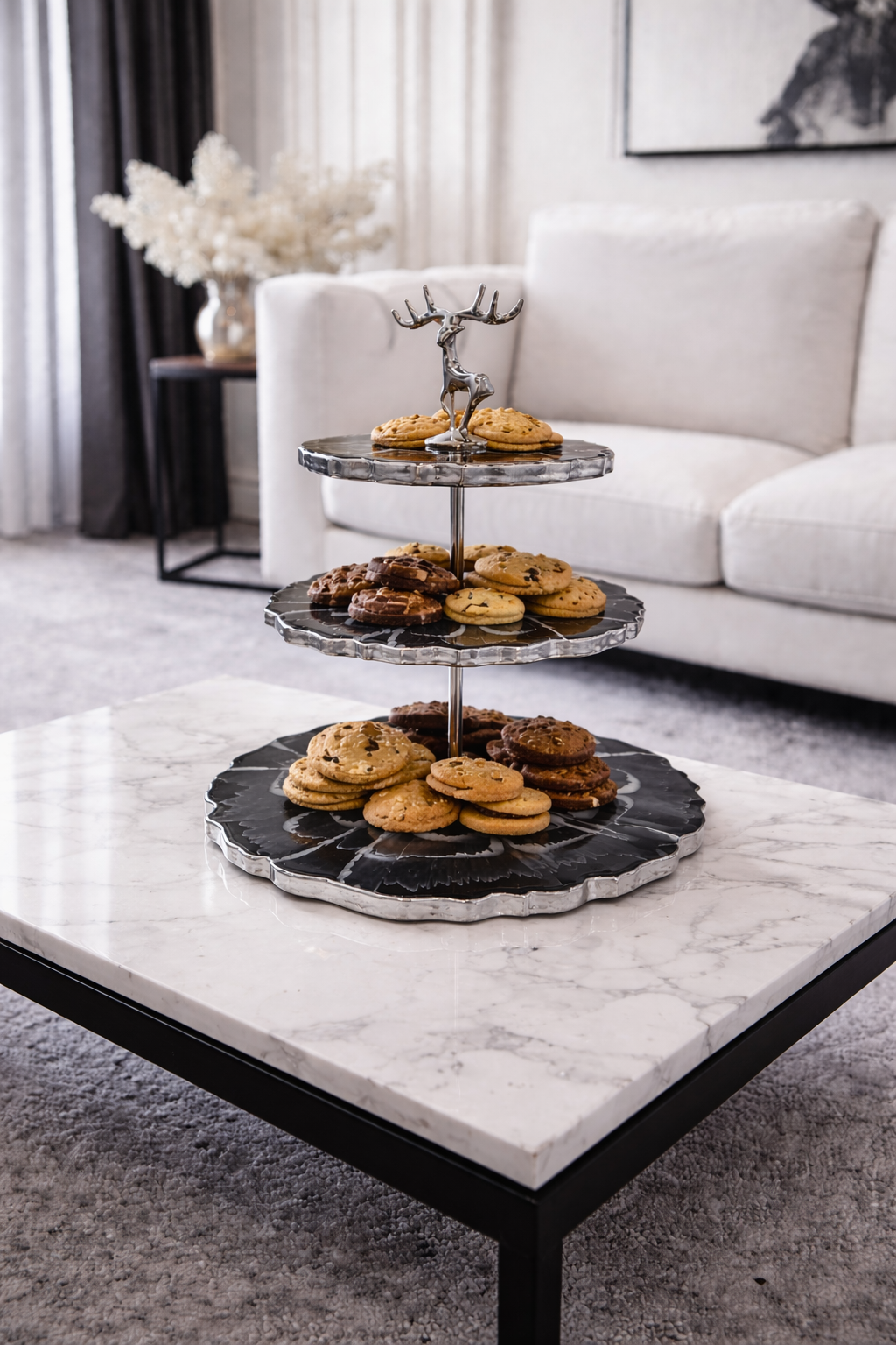 Trijų aukštų serviravimo padėklas – įspūdinga ir praktiška interjero detalė.