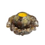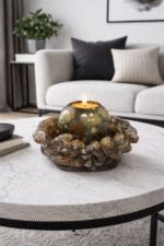 Rankų darbo žvakidžių komplektas, kuriame natūralūs akmenys, kriauklytės ir kiti gamtos lobiai įamžinti epokside.
