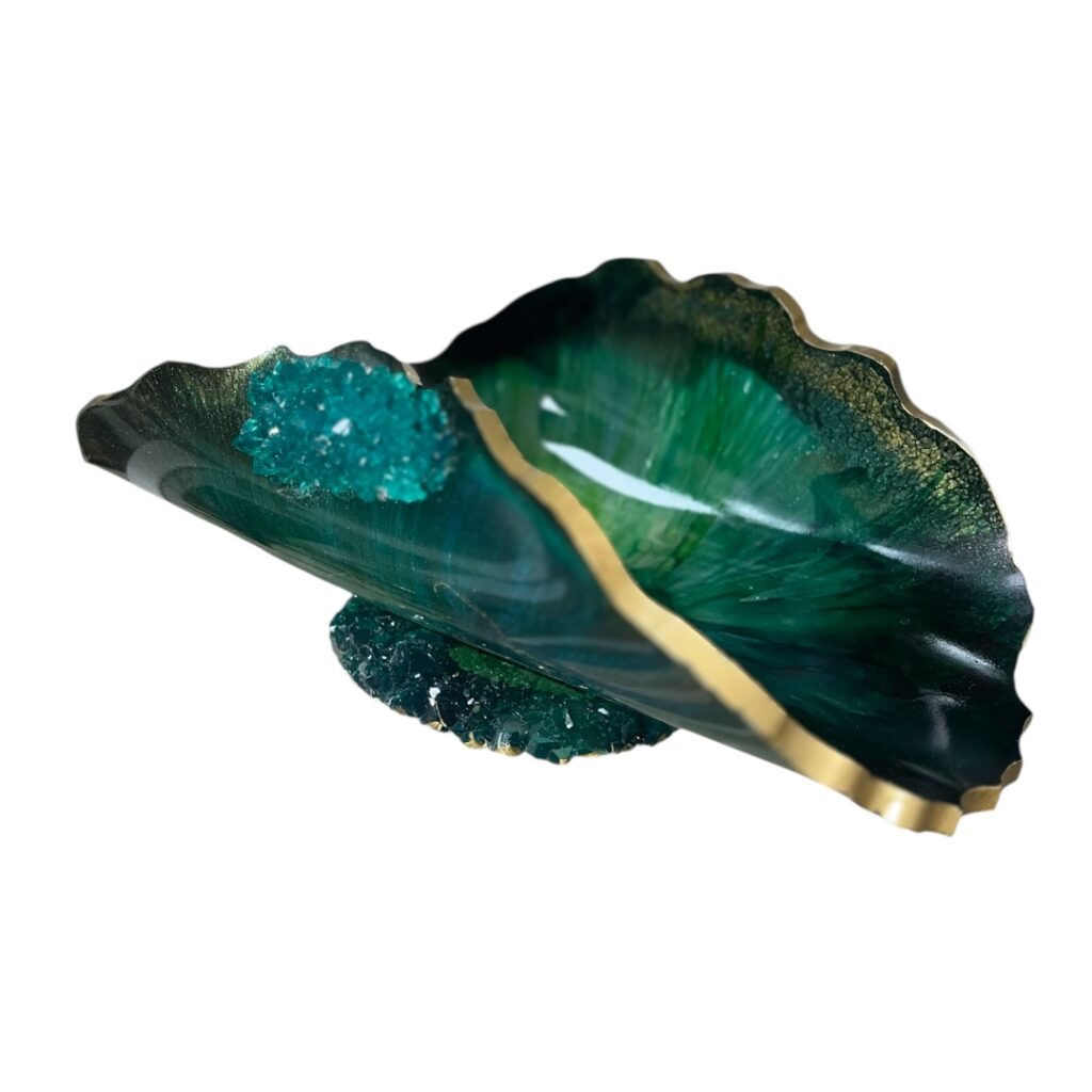 Rankų darbo žvakidžių komplektas, kuriame natūralūs akmenys, kriauklytės ir kiti gamtos lobiai įamžinti epokside.
